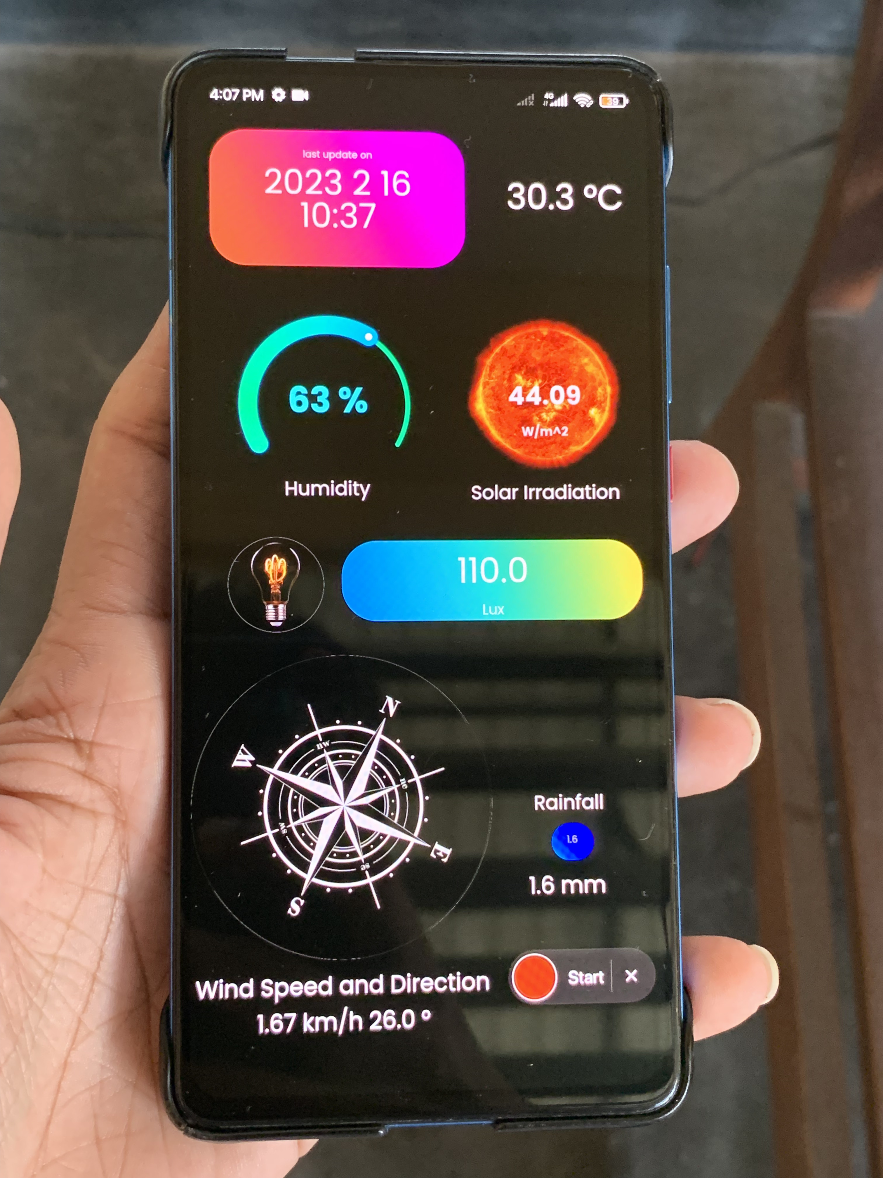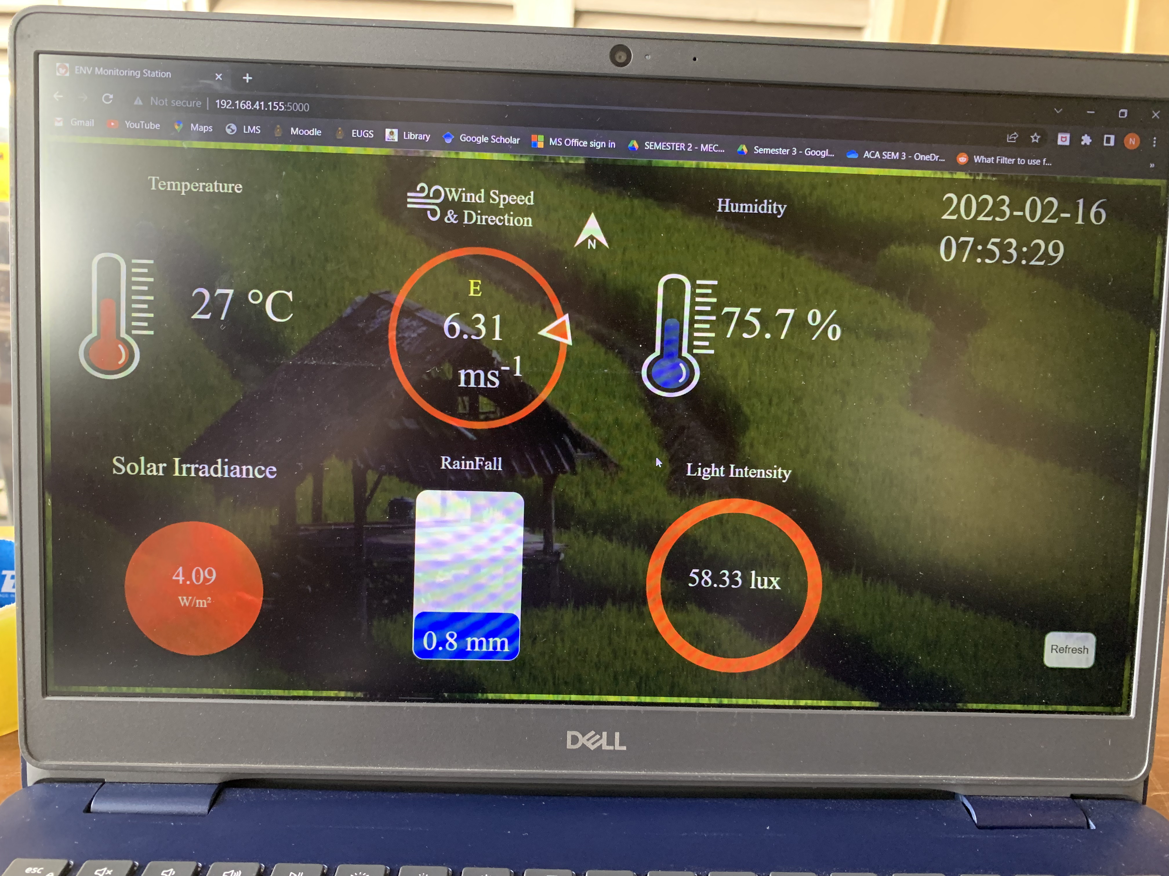 An IoT-based monitoring station that acquires ambient temperature, relative humidity, solar irradiance, light intensity, wind speed & direction, and rainfall. The system blends commercial sensors with custom instruments, an ultrasonic anemometer for wind, a tipping-bucket mechanism for rainfall, and a bidirectional panel for irradiance, to deliver accurate, real-time environmental data. Signals are conditioned, calibrated, and streamed to a backend for visualization on dedicated web and mobile applications, enabling timely insights and decision support.