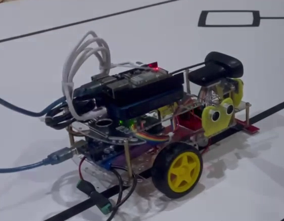 This project delivers an indoor navigation robot that follows a black path using an 8-IR PID controller, avoids obstacles with ultrasonic sensing, and executes junction turns from a hybrid sign-recognition pipeline. Symbolic signs (BUS STOP, TRAIN, PARKING) are classified on the Raspberry Pi using a Random Forest model with HOG+HSV features, while numeric speed signs (20, 100) are read by EasyOCR from red circular ROIs. Parallel RF and OCR detections are fused to stabilize results, triggering pause/stop events and guiding left/straight/right decisions at the 4-way junction. Modes include manual, line follow, and obstacle-assist, with wall following engaged when the line is lost. A Bluetooth-based Android app provides manual controls (forward, back, left, right, stop), speed adjustment, destination selection, and mode switching through a simple GUI, enabling seamless human-robot interaction